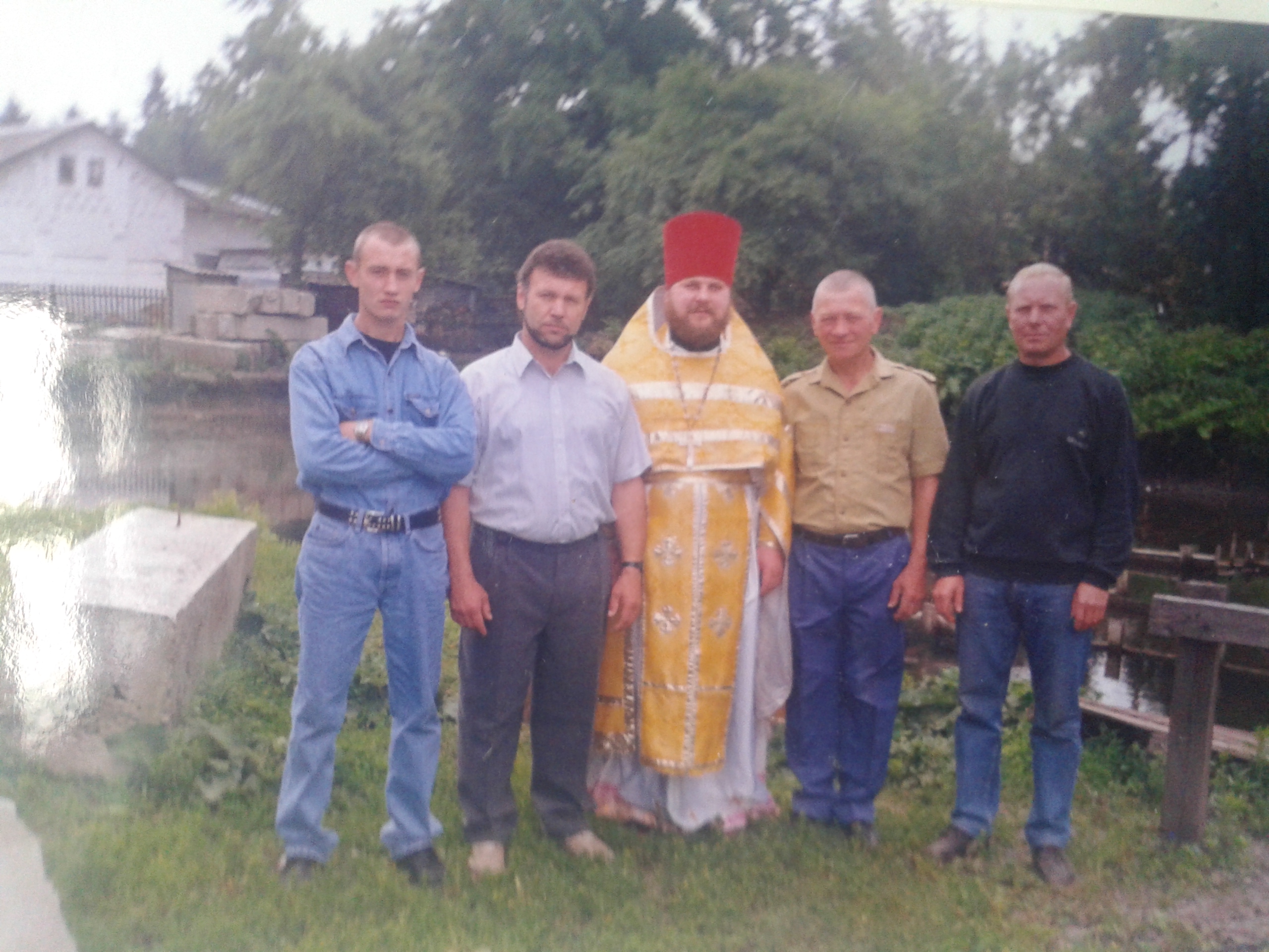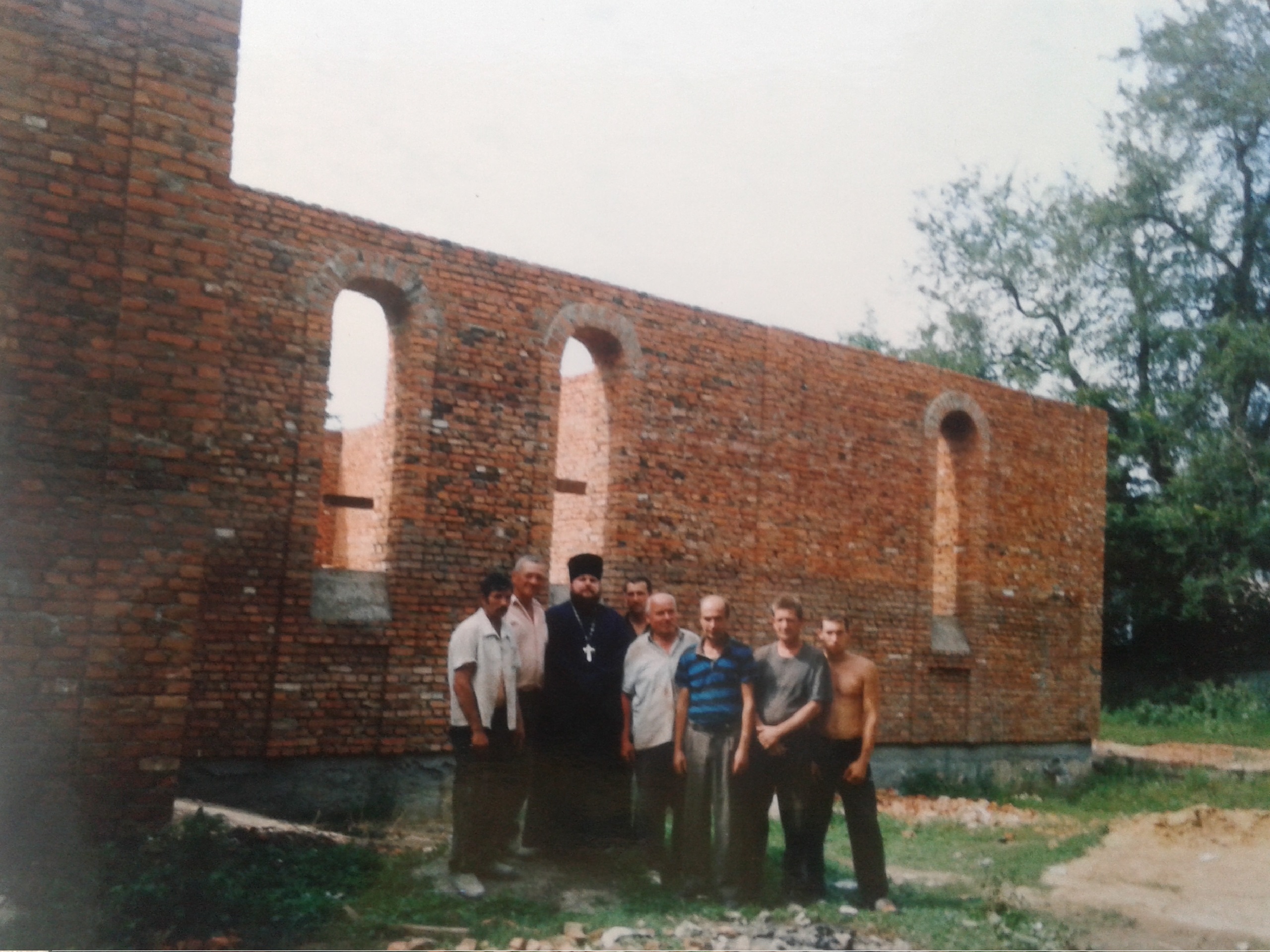 Настоятель з будівельниками до і після побудови першого ярусу храму.